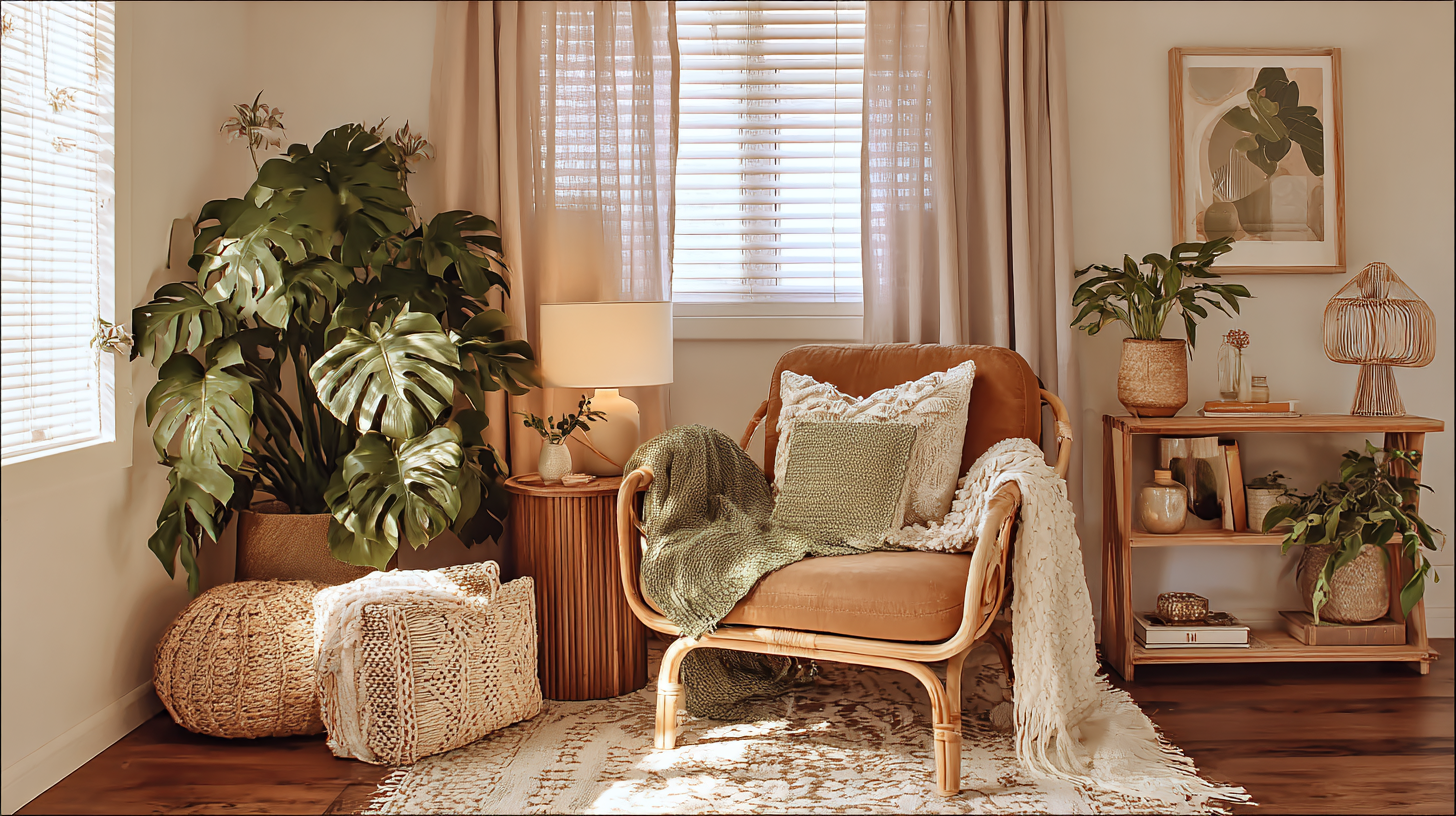 - Rattan/wicker accent pieces: One rattan mirror or wicker chair signals the style. You don’t need a full set.