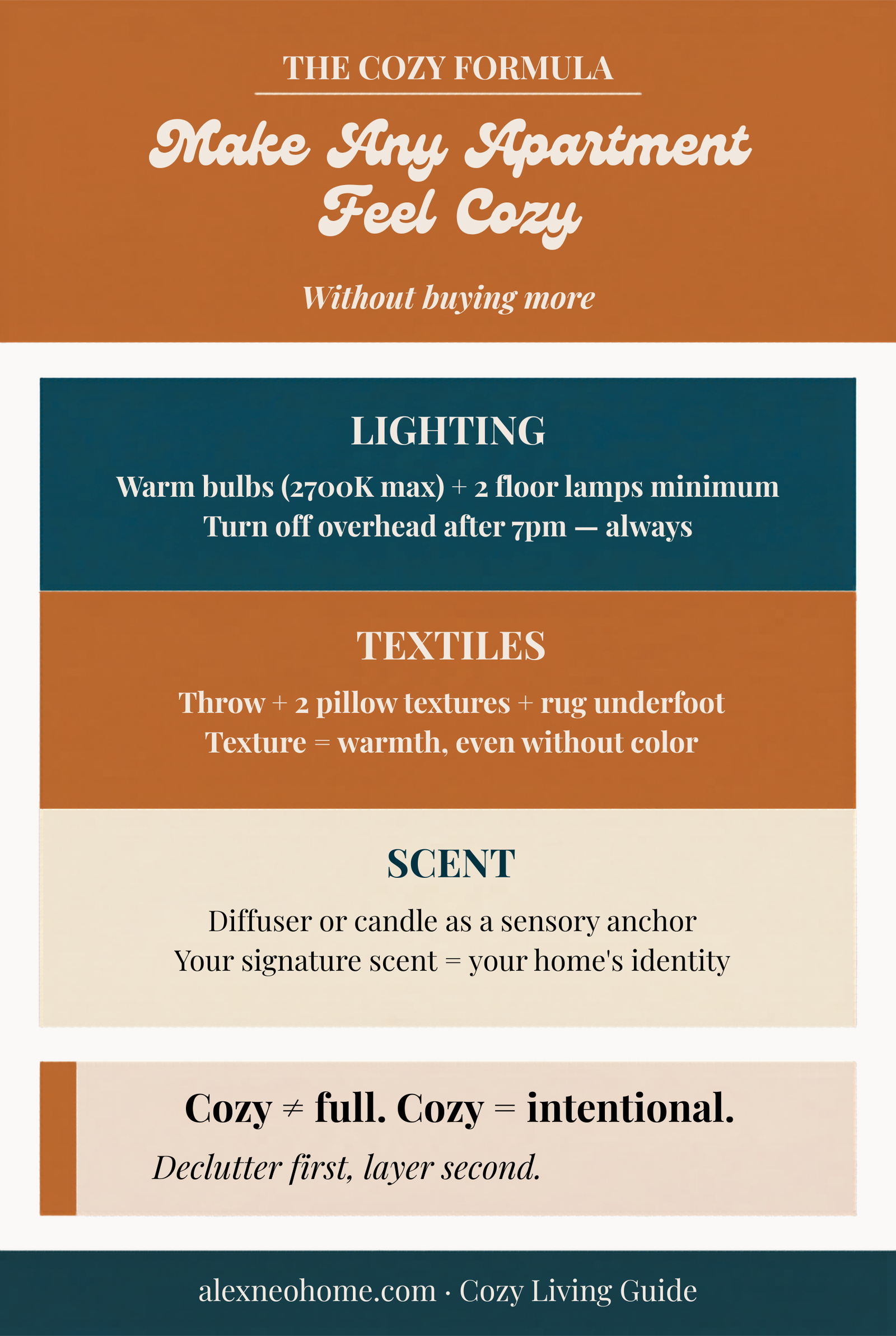 Coziness isn’t about buying more stuff — it’s about layering four specific elements in the right order. There’s actually a system to it. The best cozy apartment ideas are layered — lighting first, then textiles, then small touches that make a space feel lived-in.
