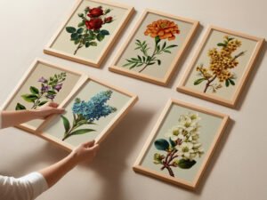 Display: 1–3 pieces max. Simple natural wood frames. Let art float in negative space.