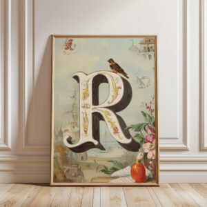Letter R Botanical Monogram Poster – Cottagecore Nursery Decor – Vintage Floral Alphabet Wall Art – Retro Typography