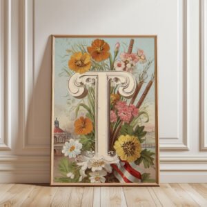Letter T Vintage Floral Art Print – Victorian Garden Decor – Antique Botanical Monogram – Wedding Gift