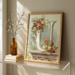 Letter U Botanical Monogram Poster – Cottagecore Nursery Decor – Vintage Floral Alphabet Wall Art – Retro Typography