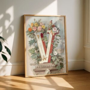 Letter V Botanical Monogram Poster – Cottagecore Nursery Decor – Vintage Floral Alphabet Wall Art – Retro Typography