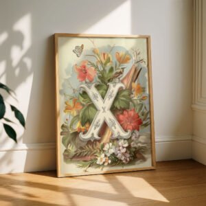 Letter X Vintage Floral Art Print – Victorian Garden Decor – Antique Botanical Monogram – Wedding Gift