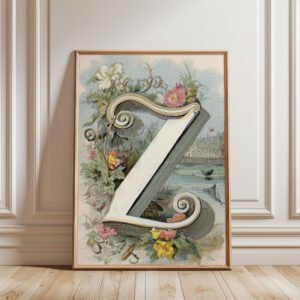 Letter Z Botanical Monogram Poster – Cottagecore Nursery Decor – Vintage Floral Alphabet Wall Art – Retro Typography