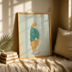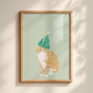 Cat on Stool Art Print – Cozy Sweater Kitty – Sage Green Decor