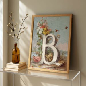 Letter B Botanical Monogram Poster – Cottagecore Nursery Decor – Vintage Floral Alphabet Wall Art – Retro Typography