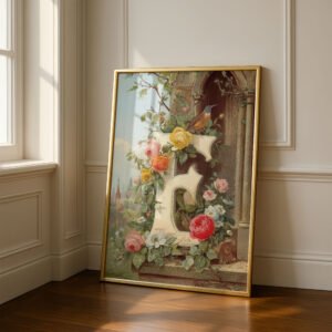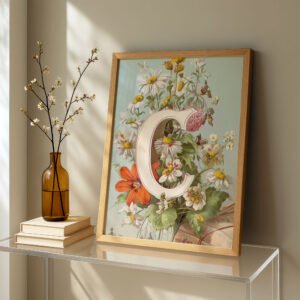Letter C Botanical Monogram Poster – Cottagecore Nursery Decor – Vintage Floral Alphabet Wall Art – Retro Typography