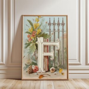 Letter F Botanical Monogram Poster – Cottagecore Nursery Decor – Vintage Floral Alphabet Wall Art – Retro Typography