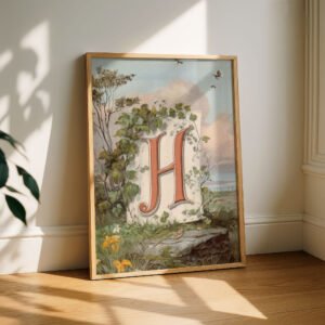 Letter H Botanical Monogram Poster – Cottagecore Nursery Decor – Vintage Floral Alphabet Wall Art – Retro Typography