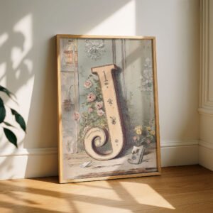 Letter J Botanical Monogram Poster – Cottagecore Nursery Decor – Vintage Floral Alphabet Wall Art – Retro Typography