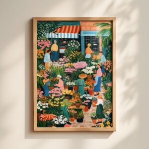 This vibrant farmers market colorful wall art captures everyday beauty in bold style. Part of the Life Around Us collection, this warm illustration celebrates simple joys — cafes, markets, and cozy moments worth framing.